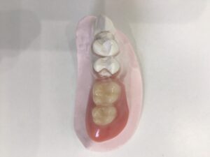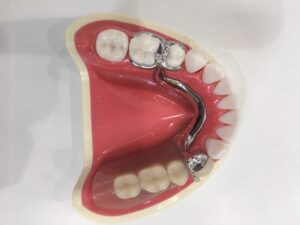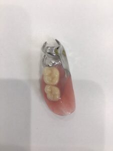 こちらも入れ歯をひっかける歯に加工をします。ただし、こちらは入れ歯がなければ歯が無くなるようにはなりません。加工を施す歯は、かぶせ物にします。技工所で被せ物にきれいに溝を掘って、そこに合わせた金属の加工を入れ歯側にもします。
