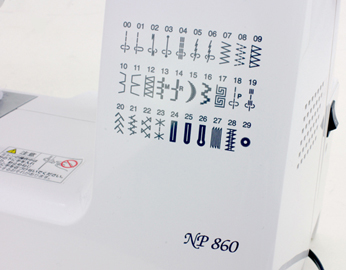 NP860の模様数はボタンホール3種類を含めた30種類の模様数になり、左基線伸縮縫い、右基線、アイレット等、より実用性の高い模様で構成されています。